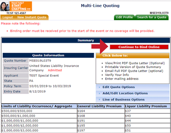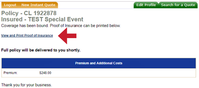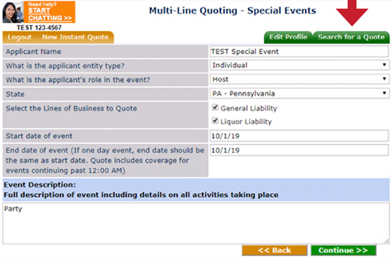 Complete the web quoting process or click “Search for A Quote” to enter your previously obtained Special Events web quote number.